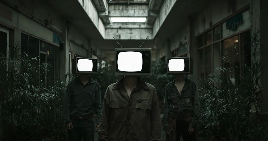 AI Generated Image. Shot captures unique performance by artists wearing CRT television sets as heads, creating a surreal experience in industrial setting. The flickering screens on the outdated TVs suggest a connection between past technologies and storytelling potential. This scene conveys mood of dystopian suis otherworldly concept; an excellent visual subject for use in media discussing performance art, creativity, societal commentary, or theme videos. Art enthusiasts could use it purely as aesthetic exploration of the fine line between futurism and faded technological past.
