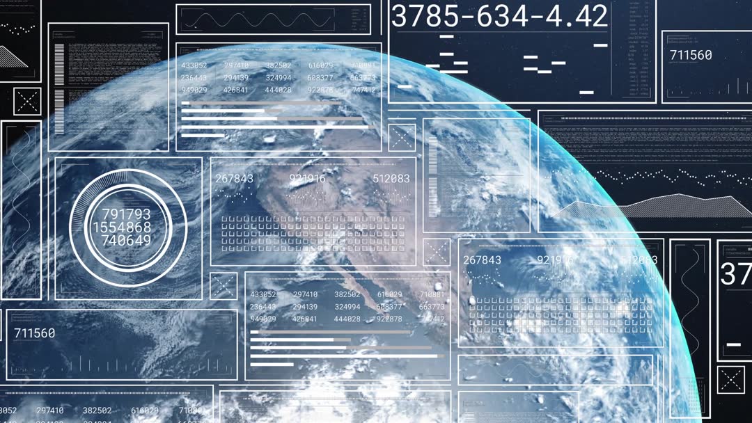Earth orbit telemetry HUD showing rotating planet with live data panels, graphs, analytics Video