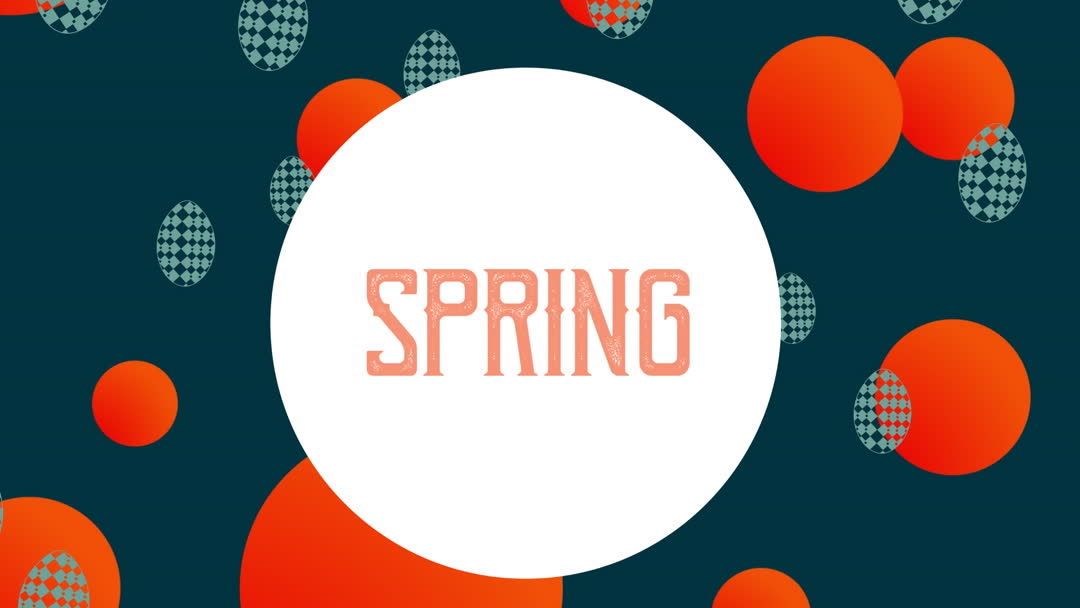 Bright and playful design featuring the word 'SPRING' with colorful Easter eggs and red dots, perfect for celebrating Easter and welcoming spring. Suitable for festive digital invites, social media posts, or event decorations.