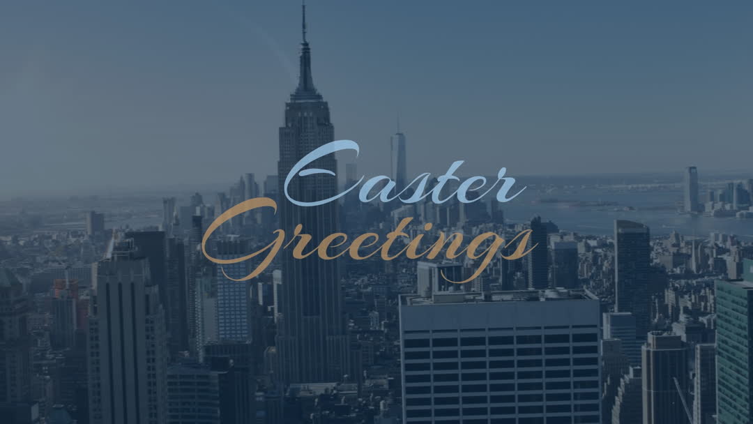 Elegant Easter greetings text gracefully over a city's skyline backdrop. Suitable for grabbing attention in digital greeting cards, online marketing during holiday promotions, and personal or corporate celebratory messages.
