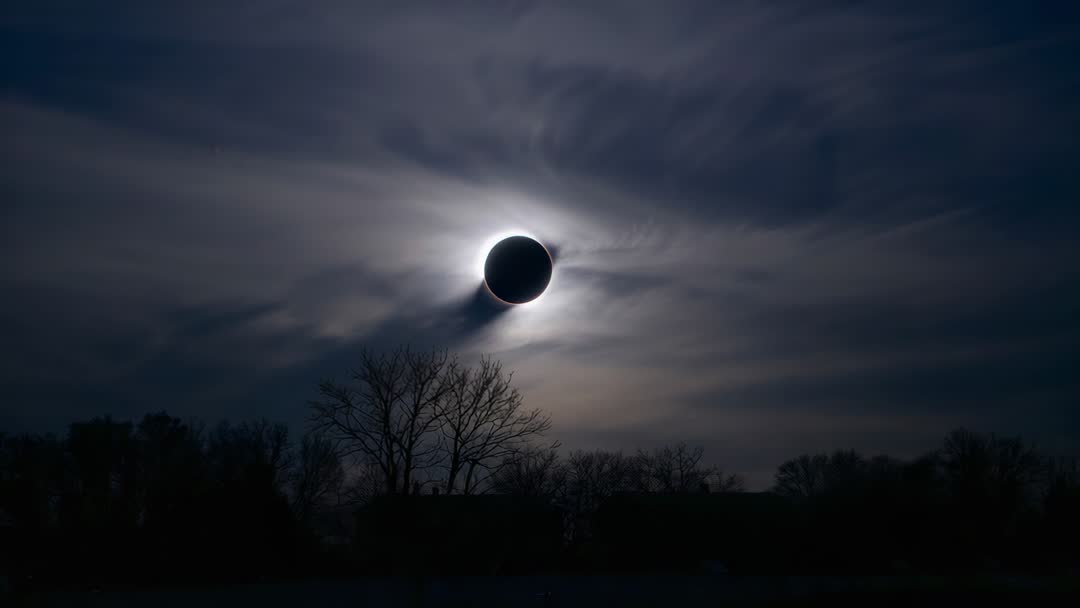 AI Generated Image. Timelapse video showing eclipsed sun drifting above silhouetted treeline while corona and thin clouds are shifting across sky. Dark lunar disk occulting sun, casting dramatic halo and faint rays through high clouds. Foreground remaining in silhouette, creating strong contrast with glowing corona. Clip performing well for astronomy documentaries, science education, weather and nature segments, planetarium presentations, and background for digital projects. Serving as opening shot for videos about solar phenomena, overlaying title graphics for event coverage, or looping as ambient background for museum exhibits and public displays. Color grading performing well for moody, cinematic projects; cropping to widescreen for extra drama or slowing playback for detailed corona study.