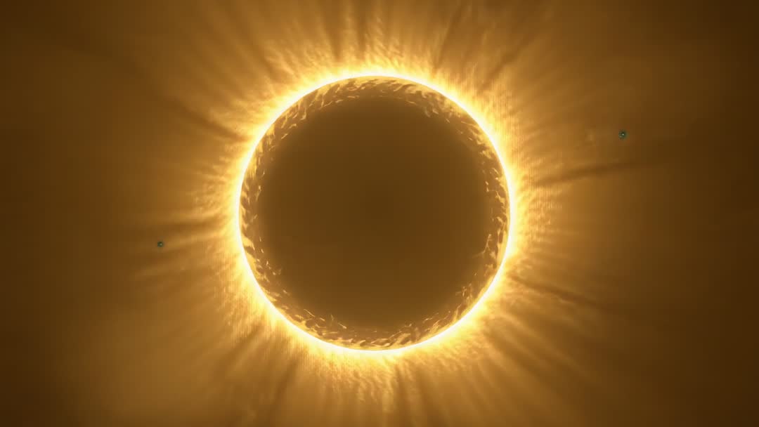 AI Generated Video. Showing centered eclipsed sun moving toward totality with dark moon silhouette covering solar disk and bright golden corona streaming outward. Featuring clear corona prominences, radial rays and halo-like glow against deep amber background, offering dramatic cinematic mood. Serving well for educational clips explaining solar eclipse mechanics, science documentaries, planetarium visuals, and news segments. Working great as hero background for title sequences, social media teasers, website banners, and conference presentations. Allowing slow-motion or time-lapse editing to emphasize motion; pairing with explanatory graphics, overlays, or soundtrack for dramatic impact. Supplying high-contrast footage for color grading and compositing in VFX projects. Including AI-generated tag for licensing transparency.