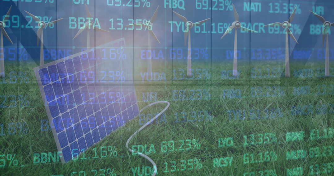 Animation features overlay of financial data and graphs with videos of solar panels and wind turbines symbolizing the connection between renewable energy and modern finance. Suitable for topics involving sustainable investment, market trends in green technology, or educational tools promoting environmental awareness through financial perspectives.