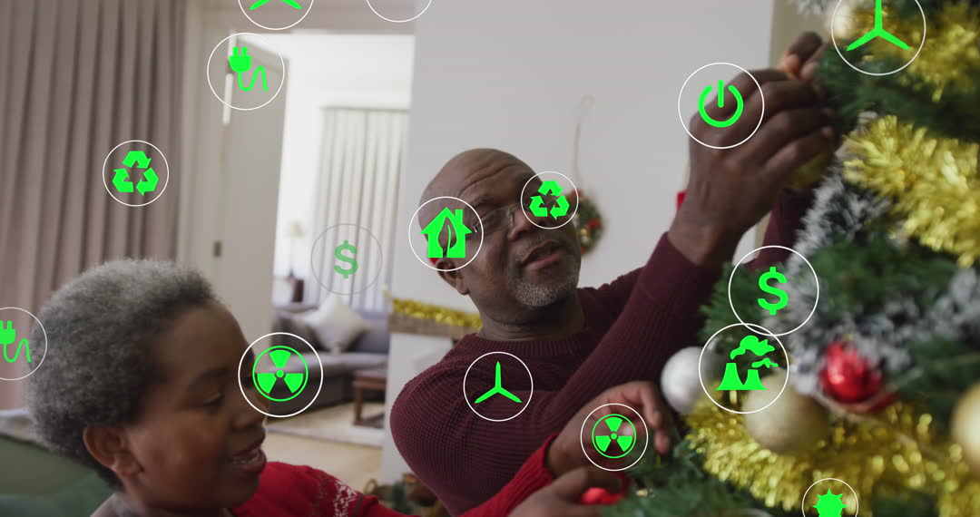 Senior African descent couple decorates a Christmas tree while numerous digital eco-friendly icons, such as recycling and green energy symbols, overlay the scene. This visual illustrates the concept of an environmentally conscious lifestyle integrated into holiday traditions. Useful for eco-awareness campaigns, holiday sustainability articles, and educational materials focused on diverse family dynamics and environmental responsibility.
