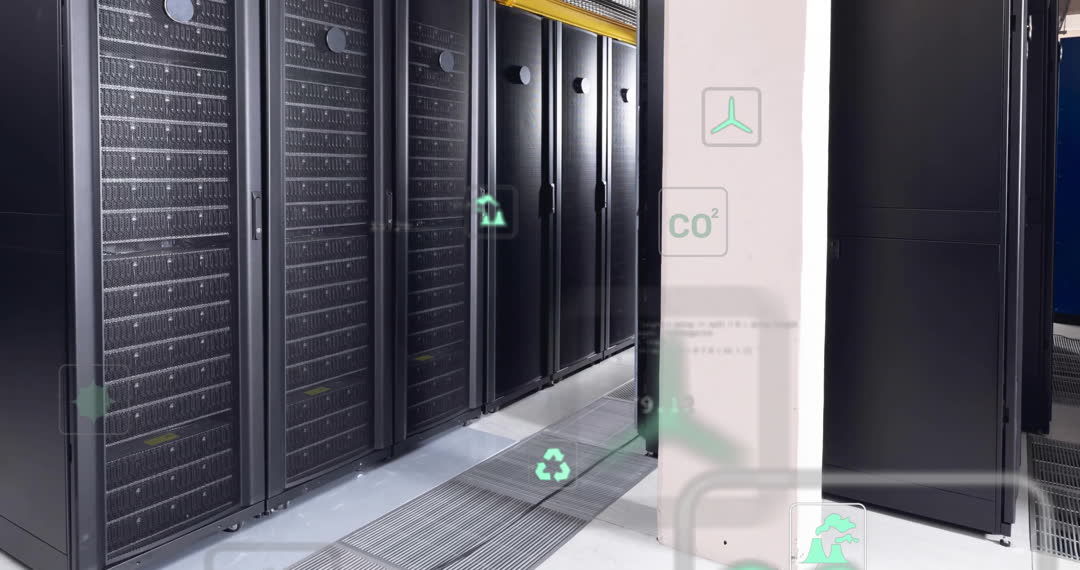 This video shows a modern data center with superimposed eco icons and data processing graphics, representing integration of green technology and sustainable practices. Ideal for illustrating concepts related to environmental responsibility in tech industries, showcasing advancements in energy-efficient data management, or feature pieces about corporate social responsibility.