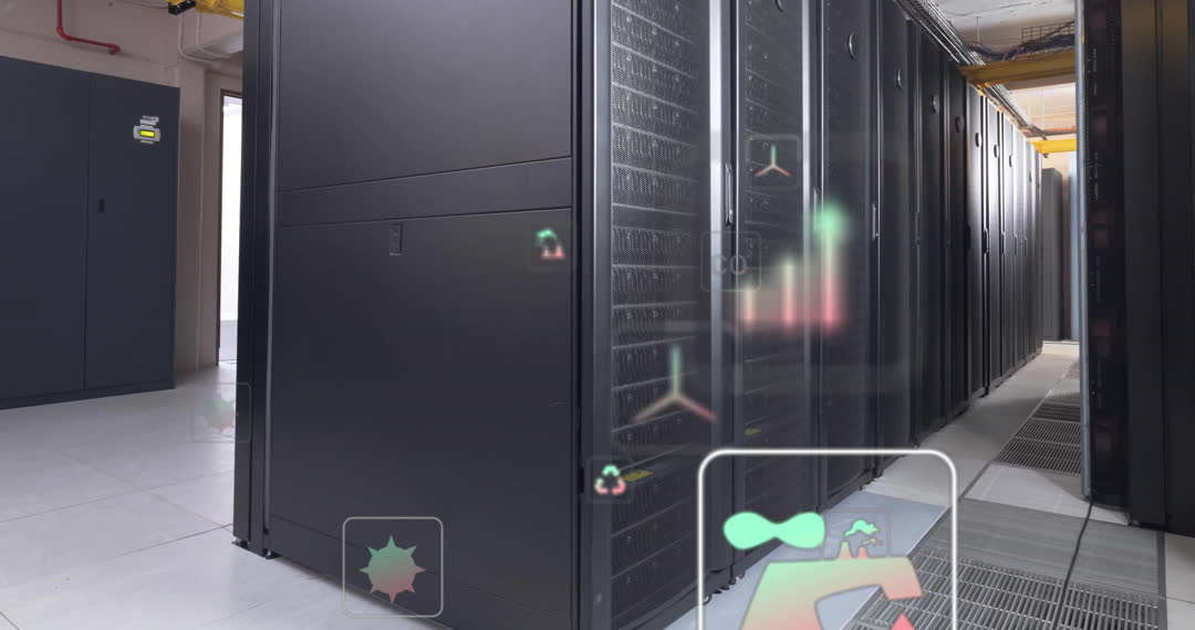 This vibrant portrayal of a data center with animated eco-themed icons placed above servers represents eco-friendly technology solutions. Suitable for use in articles or videos discussing sustainable IT infrastructures, green computing practices, and innovations in data management technology.