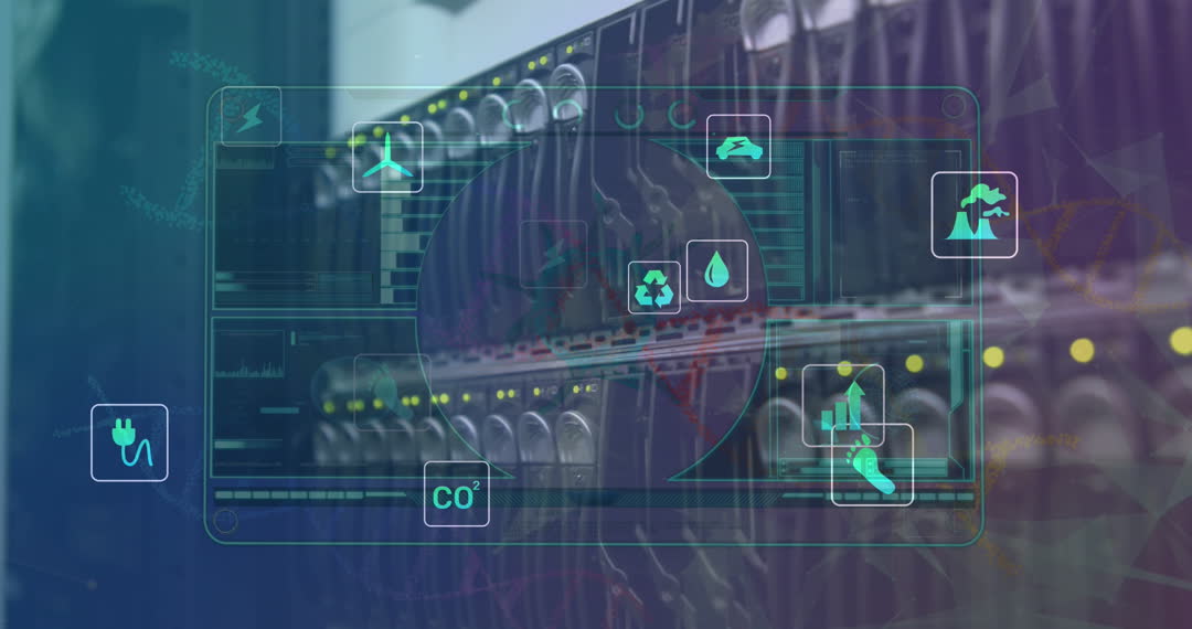 A digital interface is overlaid on data servers, displaying eco-friendly icons related to energy, recycling, and emissions. This video is suitable for use in contexts such as presentations on sustainable technology, eco-innovation in ICT, and modern network solutions. It highlights the intersection of environment and technology, ideal for businesses or educators promoting green IT solutions.