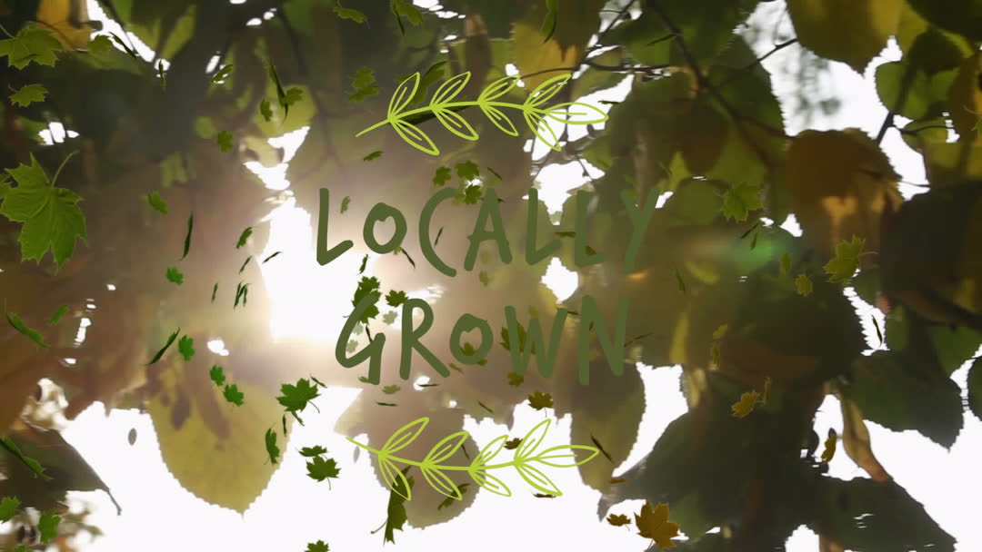 Animation presents 'Locally Grown' message with overlay of vibrant green leaves blowing. Conveys themes of sustainability and promotes eco-friendly lifestyle. Useful for campaigns focused on organic farming, environmental awareness, and promoting local produce.