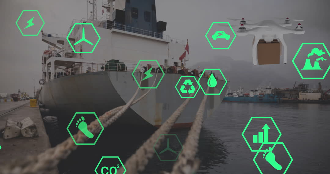 The video depicts a juxtaposition of a traditional ship in a sea port and a drone, both surrounded by eco-friendly icons and data symbols. It signifies innovation in shipping technology and underlines the use of drones for sustainable logistics solutions. These visuals are useful for presentations on modern advancements in eco-friendly global trade practices, green technology in transport, and environmental benefits of new maritime trends.