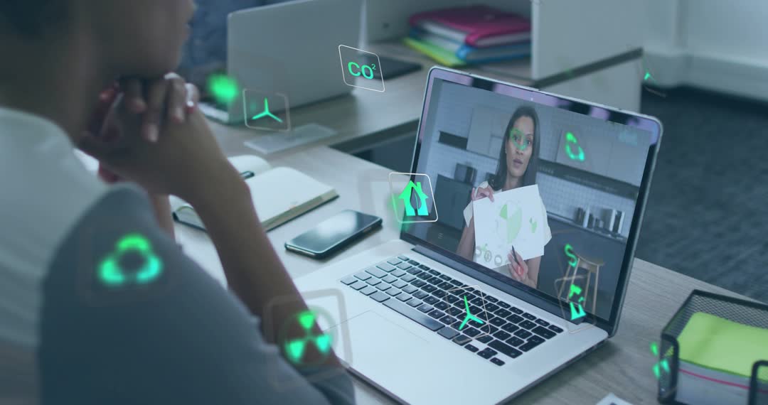 Eco-conscious professional joining an engaging online consultation, analyzing a presenter sharing innovative sustainability practices via charts on laptop. Immutable green symbols overlay work environment, signifying focus on environmental-friendly innovation. Useful for emphasizing communication technology facilitating sustainability education, alongside remote job dynamics.