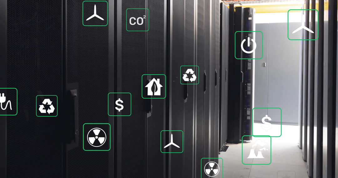 Ecology icons overlay modern server room, illustrating eco-friendly and sustainable technology practices. Perfect for use in presentations about environmental impact in IT, promotional materials on sustainable business practices, or articles about green technology advancements.