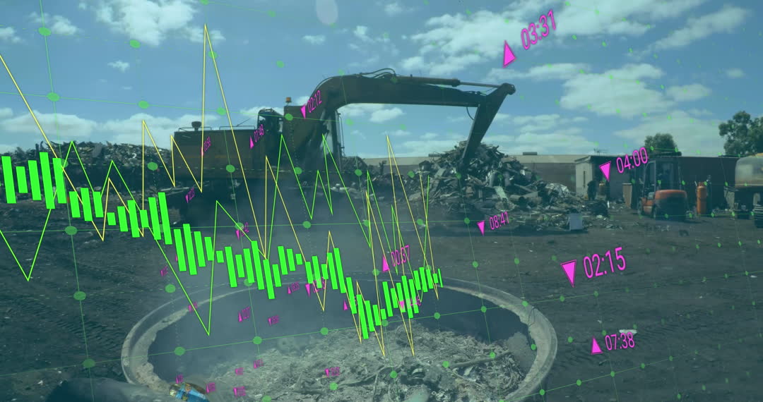 Visualizing real-time data integration within landfill operations, this scene blends industry technology with economic analytics. Could be used for illustrating articles about sustainability, technological advancements in waste management, or economic growth sectors.