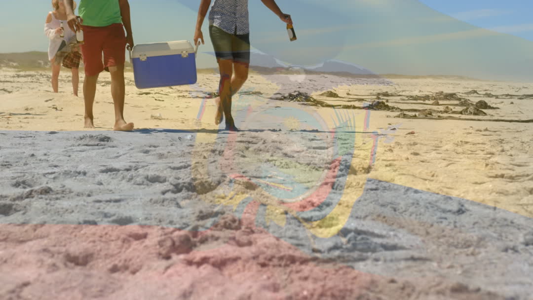 Vibrant overlay of Ecuador's national flag on friends exploring a sunny beach conveys ideas of global unity and cultural exploration. This visual can be used in travel campaigns promoting Ecuador, multicultural tourism, or global friend networks. Suitable for brands emphasizing diversity and cross-cultural experiences.