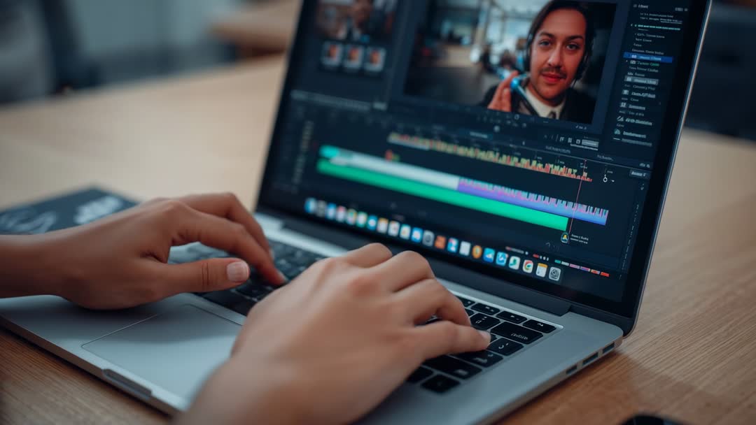 AI Generated Image. Short video clip showing hands trimming timeline on laptop while playhead moving across colorful video and audio tracks. Preview window displaying on-screen presenter during edit. Workspace including notebook and smartphone placed on wood table, creating modern minimalist feel. Shallow depth of field keeping focus on hands and screen. Usage ideas: using for promoting video editing software, online courses, tutorials, post-production services; supporting blog posts and articles about remote collaboration, content creation workflow, freelance editing; creating social media thumbnails, ad banners, website hero visuals for creative agencies and video producers; serving as background footage for corporate training, tech product demos, UX case studies. Production tips: using crop to emphasize keyboard and timeline for hero banner layouts; adding caption overlays to highlight features like trimming, review, collaboration; adjusting color grading to match brand palette and enhance cinematic look.