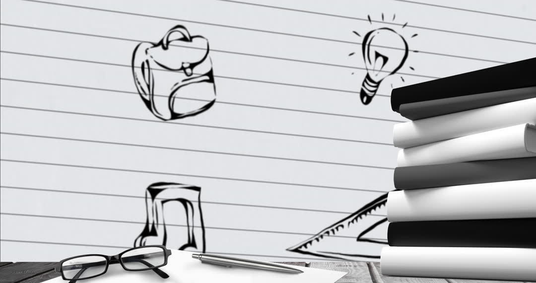 Scene creatively blending educational themes with symbolic illustrations. The stacked books and writing instruments emphasize learning, as seen alongside doodles of a light bulb, backpack, and notebook, echoing educational creativity. Ideal for concepts related to innovative learning methods, back-to-school campaigns, or creative brainstorming sessions.
