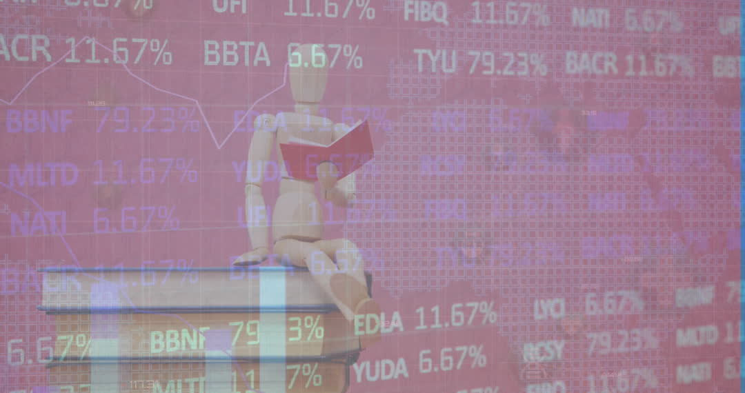 Detailed animation portraying the intersection of education and digital data. Mannequin with books used creatively with layering of dynamic stock market data, suggesting digital transformation in learning. Ideal for presentations on modern educational technology or digital transformation strategies.
