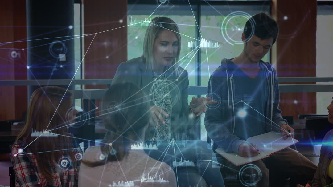 Overlay of network connections in classroom setting showing students collaborating conveys importance of technology in modern education. Symbolizes innovation, communication, and technology-led learning. Suitable for content on digital initiatives in education, collaborative studies, or tech-enhanced learning environments.