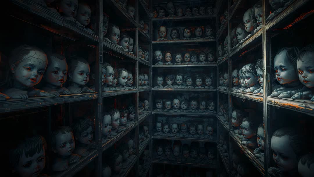 Eerie Depth of Porcelain Doll Heads in Atmospheric Room Video