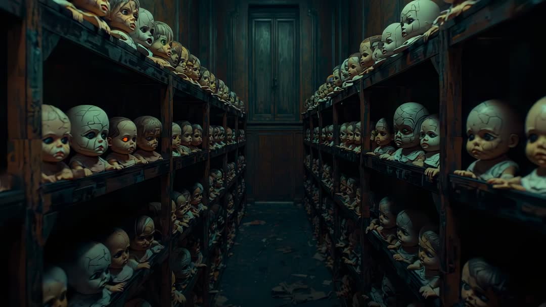 AI Generated Image. A camera dollies through a dark corridor lined with rows of haunted, decaying dolls, their eyes flickering ominously in a dim and eerie lighting. This unsettling scene evokes a vintage horror vibe, perfect for thriller projects or setting an eerie mood. Ideal for use in horror films, videography case studies, and multimedia projects emphasizing haunted or suspenseful themes.