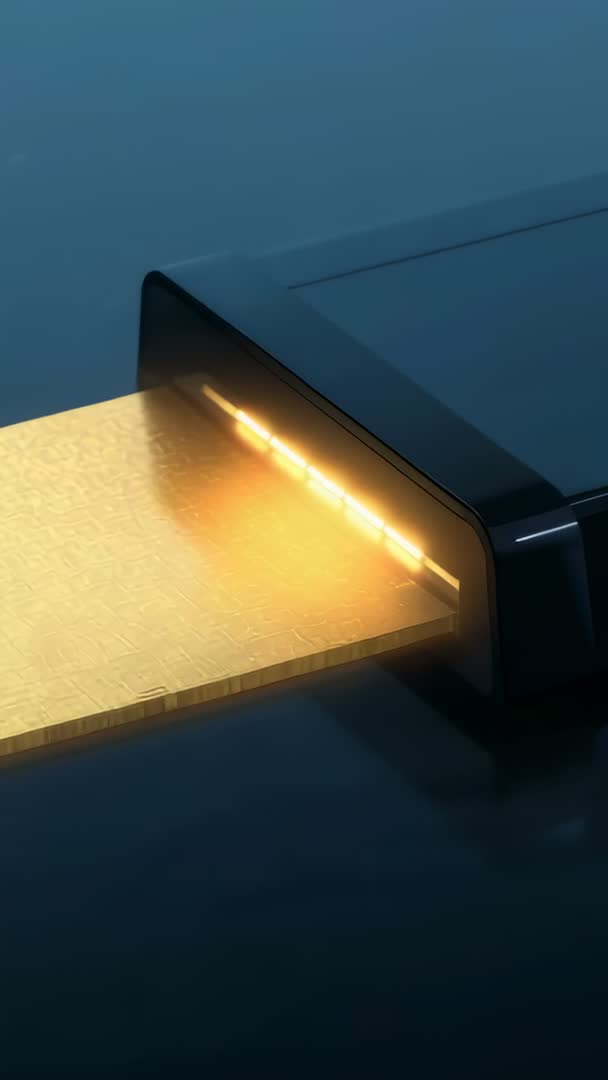 AI Generated Video. Vertical video showing gold panel being smoothly ejected from glossy black housing while warm LED row is activating and revealing textured metallic brass finish. Camera is holding tight close-up on panel edge with shallow depth of field, highlighting warm glow, reflections, and surface detail. Motion is cinematic and steady, with controlled studio lighting creating premium mood. Clip is ideal for luxury product reveal, technology launch, fintech or jewelry branding, mining and metallurgy concept, manufacturing demo, or modern electronics marketing. Use as hero opener, logo reveal, social media vertical ad, title background, lower-third backdrop, or looping background for presentation. Recommend trimming for seamless loop, applying color grade for desired mood, and adding subtle sound design for maximum impact.