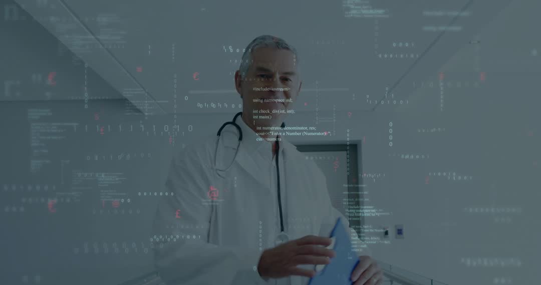 A senior doctor stands in modern hospital hall holding folder, reviewing patient records while digital code floats around, symbolizing technological integration in healthcare. Ideal for promoting technology in medicine, showcasing advancements in medical procedures, or illustrating modern healthcare systems. This could appeal to healthcare professionals focused on innovation and future solutions in medical care.