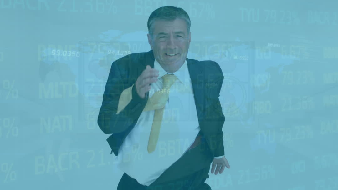 Caucasian senior businessman actively running, overlaid with digital stock market numbers and world currency symbols. Represents concepts of business agility in a fast-paced global economy. Ideal for financial, economic forecasts, business strategy themes.