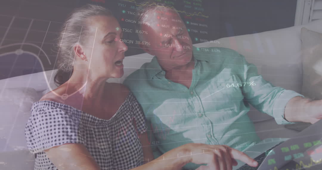 Senior couple engaged in home financial analysis using laptop and illustrations of stock market data. This can be ideal for usage in articles about financial planning, retirement investments, use of technology by seniors, and stock market education.