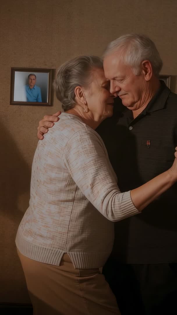 AI Generated Image. Vertical footage capturing senior couple embracing, touching foreheads, sharing tender intimate moment in cozy home. Soft warm lighting highlighting facial expressions and gentle body language, conveying deep companionship and long-term affection. Framing optimized for vertical platforms, suitable for reels, stories, social ads, website hero banners, and slideshow montages. Usage ideas: illustrating retirement community marketing, eldercare and home health campaigns, relationship and family articles, anniversary greeting videos, memory keeping and documentary projects. Editing tips: pairing with soft piano or acoustic guitar, adding slow zoom and gentle color grade, inserting title text and subtle ambient sound for emotional impact. Authentic mood and relatable styling making footage useful for storytelling about aging, love, caregiving, and senior wellbeing.