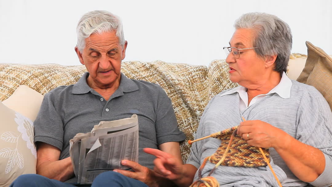- Elderly Couple Relaxing with Knitting and Newspaper at Home