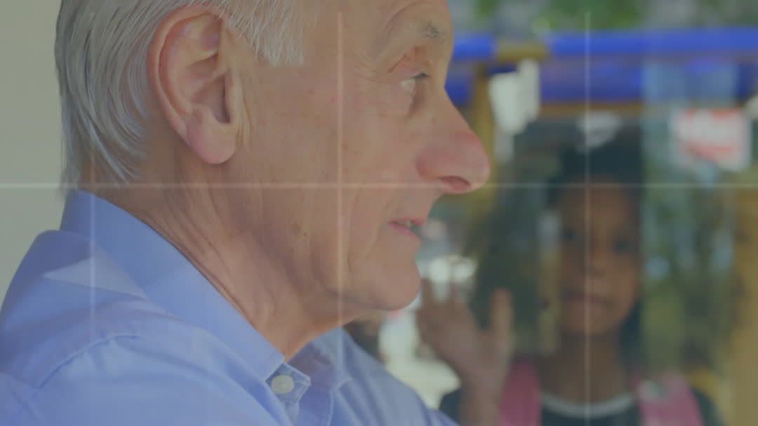 An elderly man with thoughtful expression watches screens through layered data graphics, with a blurred background showing a young child. This can be used for themes like technology and intergenerational connection, exploring legacy or personal stories linked to data visualization.
