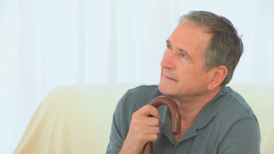 This video depicts an elderly man with graying hair pensively sitting on a comfortable couch, resting his hands on a walking cane. He appears contemplative, possibly reflecting on memories or personal thoughts. This quiet and relaxed setting may appeal to projects aimed at seniors, health and wellness for the aging, elderly meditation and insight features, or advertisements focused on furniture and comfort products.