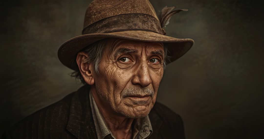 AI Generated Image. Reflecting a timeless and atmospheric quality, the video captures an elderly man in a brown fedora sitting against a moody studio backdrop. His contemplative and introspective glance draws viewers into his personal narrative. Useful for pieces conveying wisdom, maturity, or vintage themes. Suitable for articles, promotions, or creative projects emphasizing involvement and enigmatic character studies.