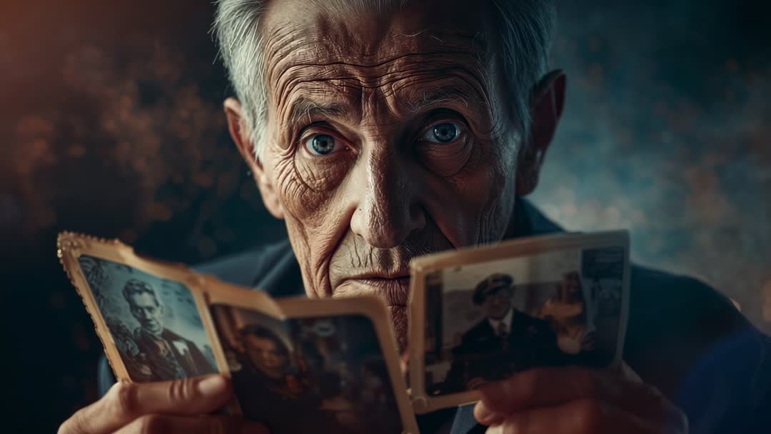 AI Generated Video. An elderly man gazes intently at a collection of vintage photographs, possibly reflecting on memories and personal heritage. The worn nature of the photographs juxtaposed against his contemplative expression suggests a moment of nostalgia and reminiscence. This visual captures themes of history, personal storytelling, and connections to the past; an ideal resource for projects focused on family history, storytelling, reflective narratives, and heritage preservation.