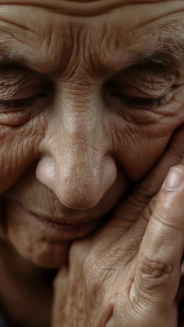 AI Generated Image. Showing intimate vertical closeup of elderly man pressing right hand to cheek, eyes closed, deep wrinkles and detailed skin texture conveying reflection and quiet emotion. Providing strong visual for eldercare campaigns, dementia and memory awareness, healthcare communications, documentary films, editorial features on aging, personal storytelling. Working well for vertical social formats including Instagram Reels, TikTok, Snapchat stories, mobile ads, in-app placements. Allowing gentle slow motion, subtle warm color grading, soft focus at edges to enhance intimacy and tenderness. Allowing cropping for square or landscape compositions while retaining facial detail for print or web. Ideal for background clip in documentary sequences, hero shot for blog headers, promotional spots for senior care services, mental health awareness reels, educational materials on gerontology and skincare.