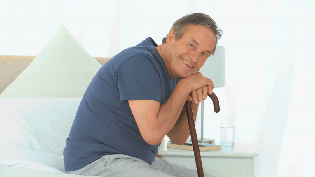- Elderly Man with Cane Smiling in Comfortable Bedroom