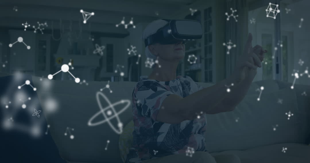 A senior woman using a VR headset engages with virtual reality in her living room, surrounded by digital molecular graphics that suggest advancements in technology. This visual represents the intersection of age and innovation, highlighting an older person's interaction with modern digital experiences. Ideal for use in articles or campaigns focused on technology accessibility for all ages, gerontechnology, or the tech industry's impact on seniors.