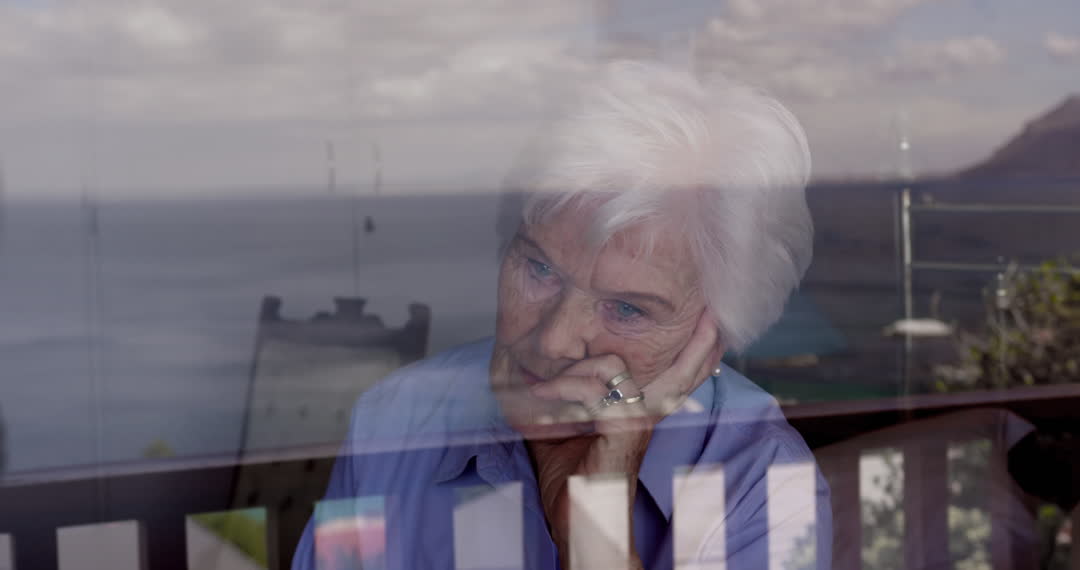 An elderly Caucasian woman is looking pensively through a window, with an overlay of ocean scenery reflected. Her thoughtful expression suggests deep reflection, adding a poignant atmosphere to the scene. This visual can be used in contexts relating to aging, solitude, contemplation, and the beauty of quiet moments of introspection.