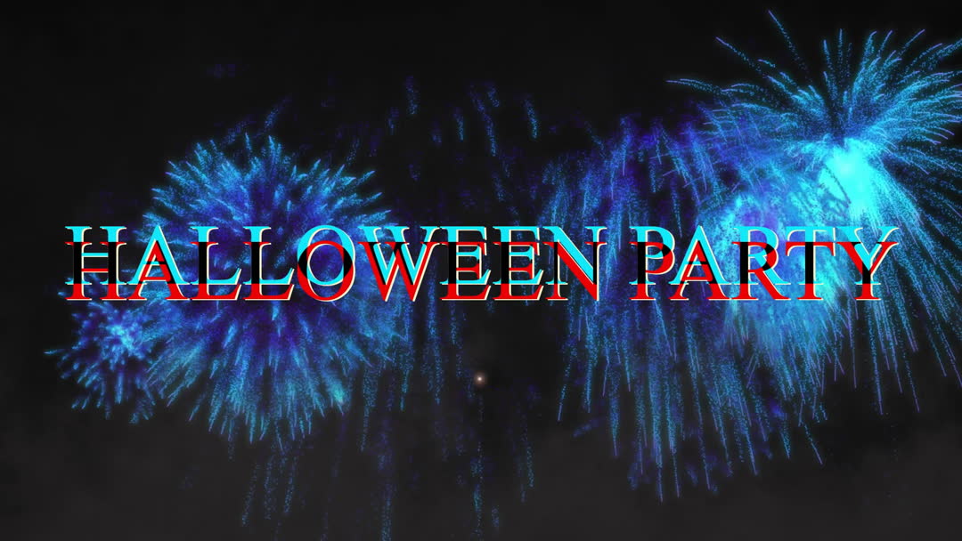 Concept art showcasing 'Halloween Party' text overlays vibrant blue fireworks. Perfect for event promotional materials, festive invitations, and themed social media announcements. Eye-catching design emphasizes celebration atmosphere and digital creativity.
