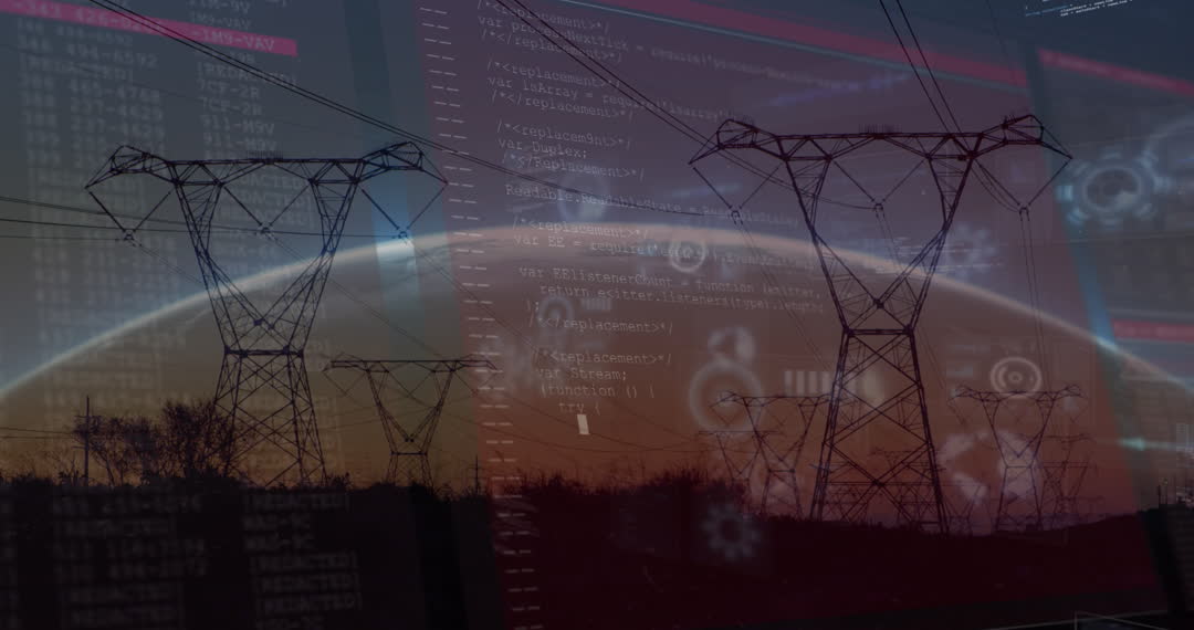 Visual showcasing the blend of electricity transmission towers and digital data interface, illustrating the intersection of traditional energy distribution and modern data processing technology. Ideal for content emphasizing innovative technological advancements in energy sectors, smart grid development features, and cybersecurity implications within the energy field.