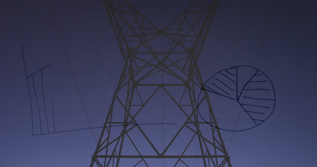 Complex visuals depicting energy and data integration through an electricity pylon and animated graphics. This is useful for topics on renewable energy, global electricity distribution, and smart technology in utility sectors.