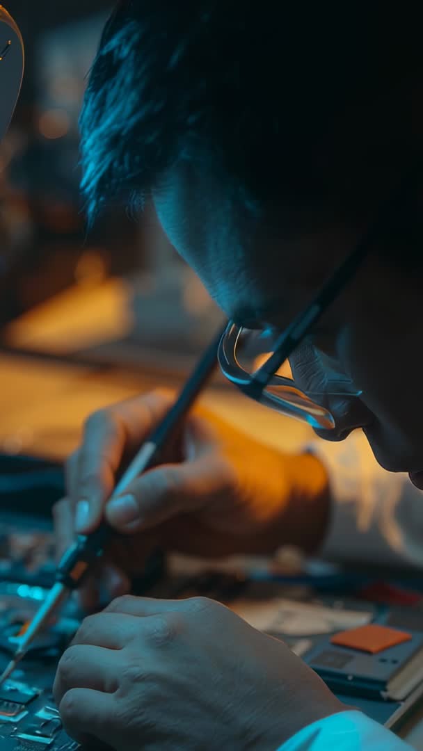 AI Generated Image. Close-up vertical video showing electronics technician soldering circuit board while inspecting joint with magnifying glass. Warm orange and cool blue lighting creating cinematic contrast and highlighting hands, soldering iron, tiny SMD components. Footage focusing on precision, steady hands, careful technique, delicate solder joints and component placement. Ideal for tech tutorials, repair walkthroughs, product demos, electronics training videos, social media reels and vertical ads. Use for website hero banners, blog headers, YouTube Shorts, Instagram Reels, TikTok clips, e-learning modules, or promotional clips for repair services. Provide editing suggestions: slow motion for soldering action, close crop on joint for emphasis, color grading to enhance moody contrast, on-screen captions for step-by-step guidance. Licensing-friendly clip suitable for commercial, instructional, and editorial projects in electronics and engineering niches.