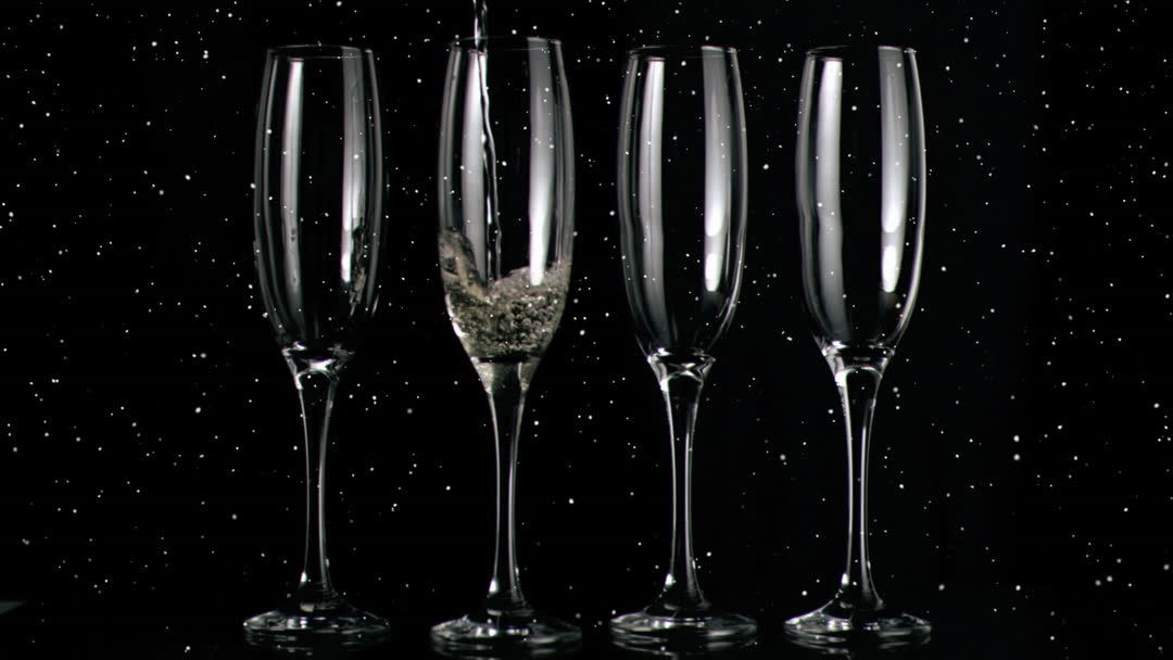 Glasses arranged in stylish line while liquid pours into one flute, surrounded by dazzling white sparkles. Imagery conveys celebratory and festive mood, ideal for use in graphics promoting New Year events, celebrations, or party invitations. Captures essence of sophistication and luxury in festive gatherings.
