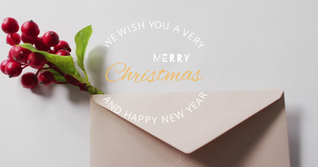 Festive illustration featuring a merry Christmas and New Year greeting overlaid on an arrangement of red berries and a beige envelope. Perfect for use in holiday cards, festive promotions, or seasonal marketing materials. This elegant design conveys warmth and celebration and is ideal for both personal and professional Christmas and New Year greetings.