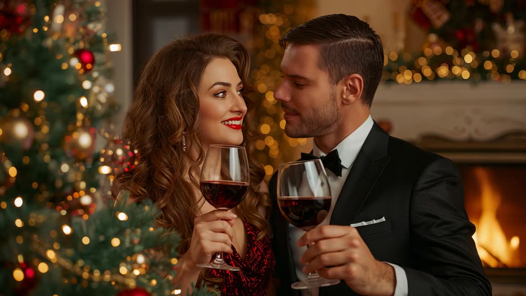 - Elegant Couple Toasting Together by Christmas Tree and Fireplace