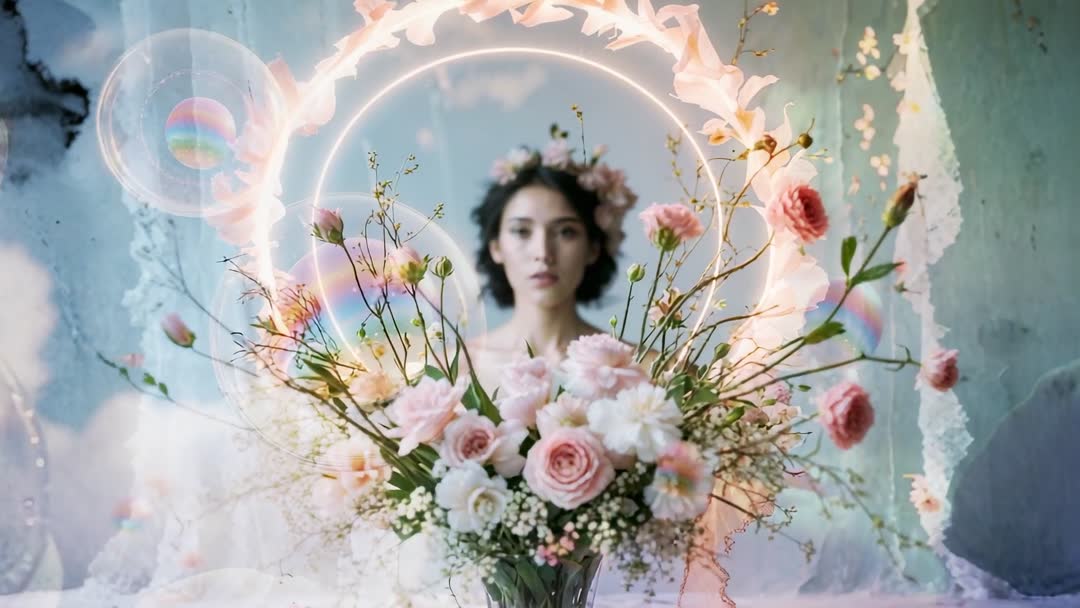 AI Generated Video. This visually striking scene surrounds a woman with a delicate halo of flowers, accompanied by ethereal elements like bubbles. The soft pastel colors and elegant floral arrangement evoke a sense of tranquility and charm. Ideal for use in fashion editorials, digital art projects focused on femininity, or marketing campaigns that emphasize beauty and serenity.