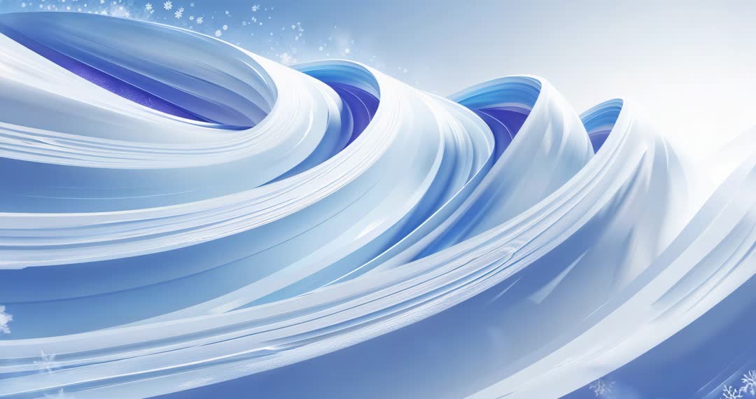 AI Generated Image. This calming animation showcases an elegant interplay of blue and white swirling ribbons against a gradient backdrop. Snowflakes accentuate the cool winter theme, creating a serene atmosphere. Perfect for use in digital presentations, artistic backdrops, animation projects, or as elegant filler content in multimedia works.