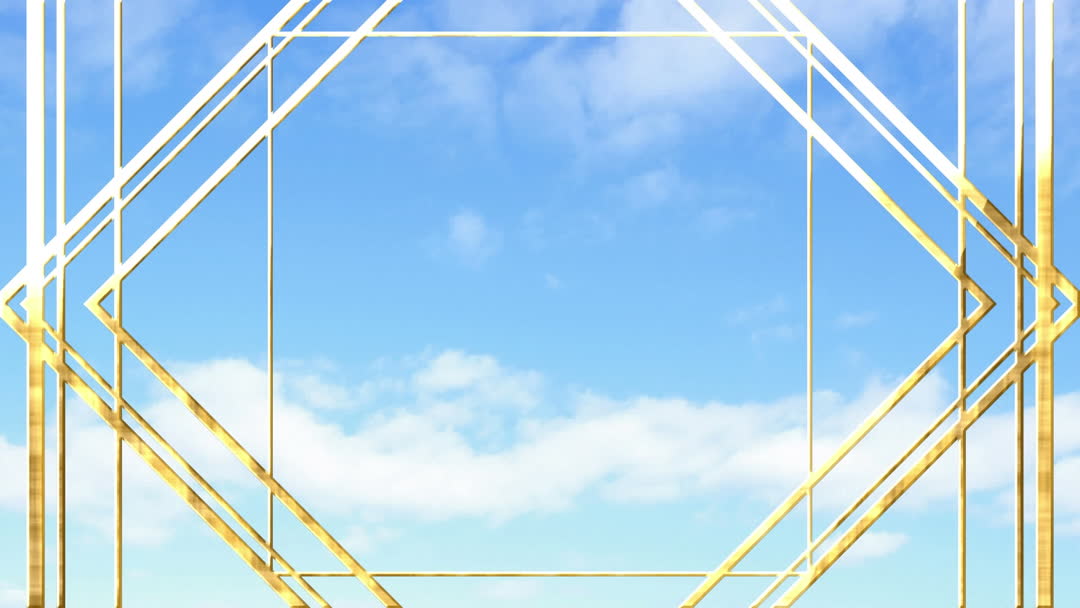 This video features a sophisticated golden geometric frame set against a clear blue sky with soft clouds, creating an elegant and minimalist art deco aesthetic. Perfect for use in design projects, invitations, or as a decorative element in marketing materials where a touch of elegance and refinement is desired.