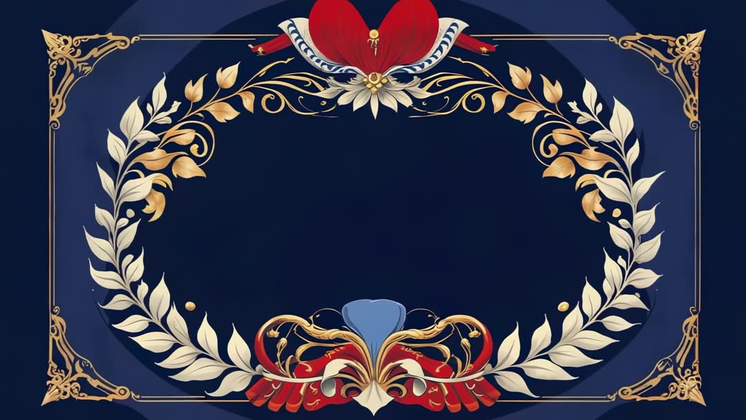 AI Generated Video. This animation features an intricate golden wreath with a red ribbon and decorative crest, pulsating with light on a rich navy blue background. The regal and luxurious design evokes a sense of prestige, fitting for applications in heraldry, elite awards, digital invitations, or aristocratic themed events. Perfect for videos needing sophisticated or ceremonial framing.