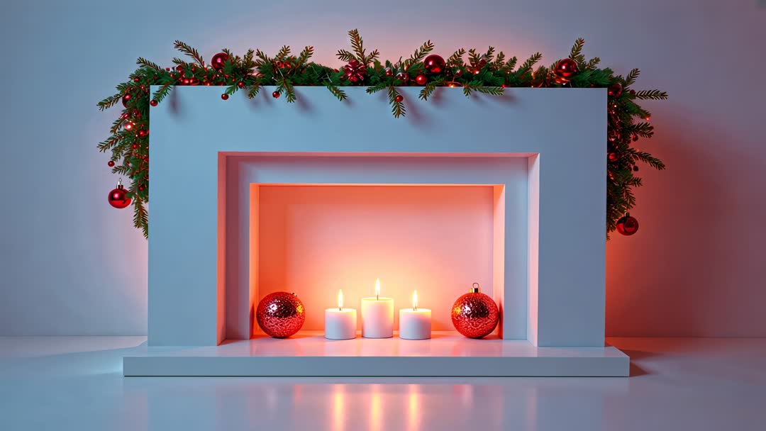 AI Generated Image. Visual symphony intertwining elegance and tranquility. Featuring a stylishly simple, minimalist fireplace adorned with verdant garlands intertwined with gleaming red baubles, it centers three flickering pillar candles casting a gentle, radiant glow. Evoking a sophisticated and peaceful holiday atmosphere. Perfect inspiration for modern Christmas interior décor, complementing branding, promotional visuals, and decorating guides embodying quintessential warmth of yuletide season.