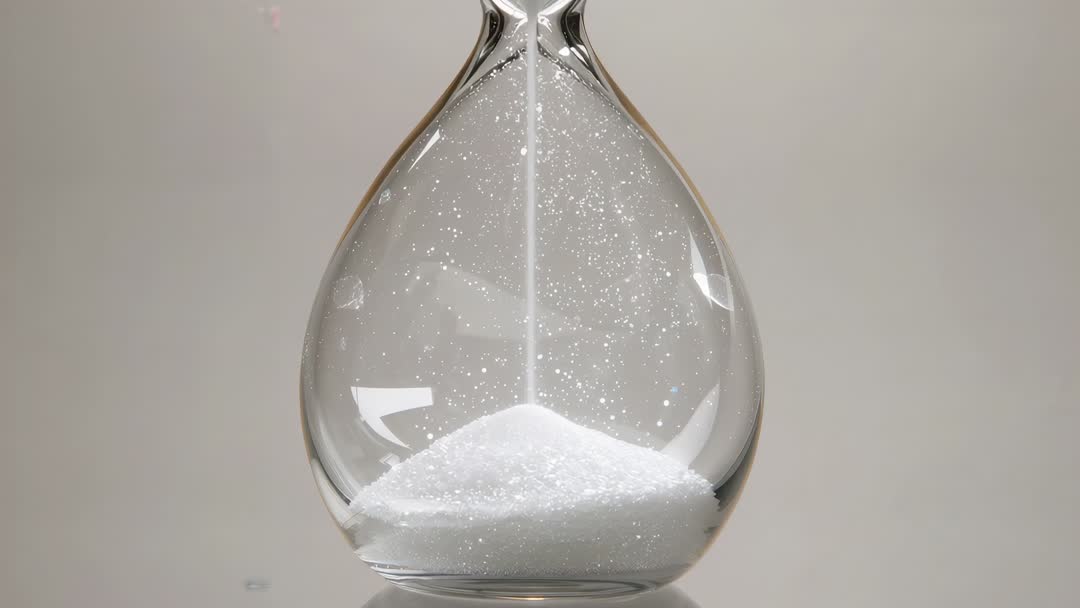 AI Generated Image. Hourglass showing white sand flowing gracefully through glass, signifying smooth passage of time. Used in projects that need themes of time and patience or in healthcare articles focusing on healing time. Added ambient appeal in meditation or mindfulness content. Emphasizes symbolism in corporate designs for strategic presentations on deadlines and achievements.